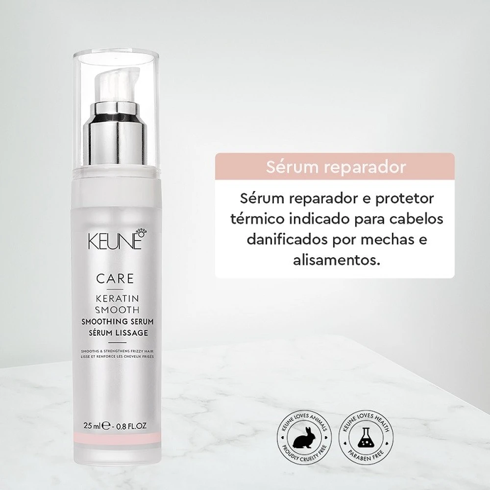 Ideal para cabelos com frizz, finos a médios, com mechas e alisamentos, Keratin Smooth Serum repõe a queratina perdida, reestruturando o fio e alinhando as cutículas, permitindo a redução do frizz e da quebra. Esse sérum funciona, ainda, como protetor térmico, pois sela as cutículas.